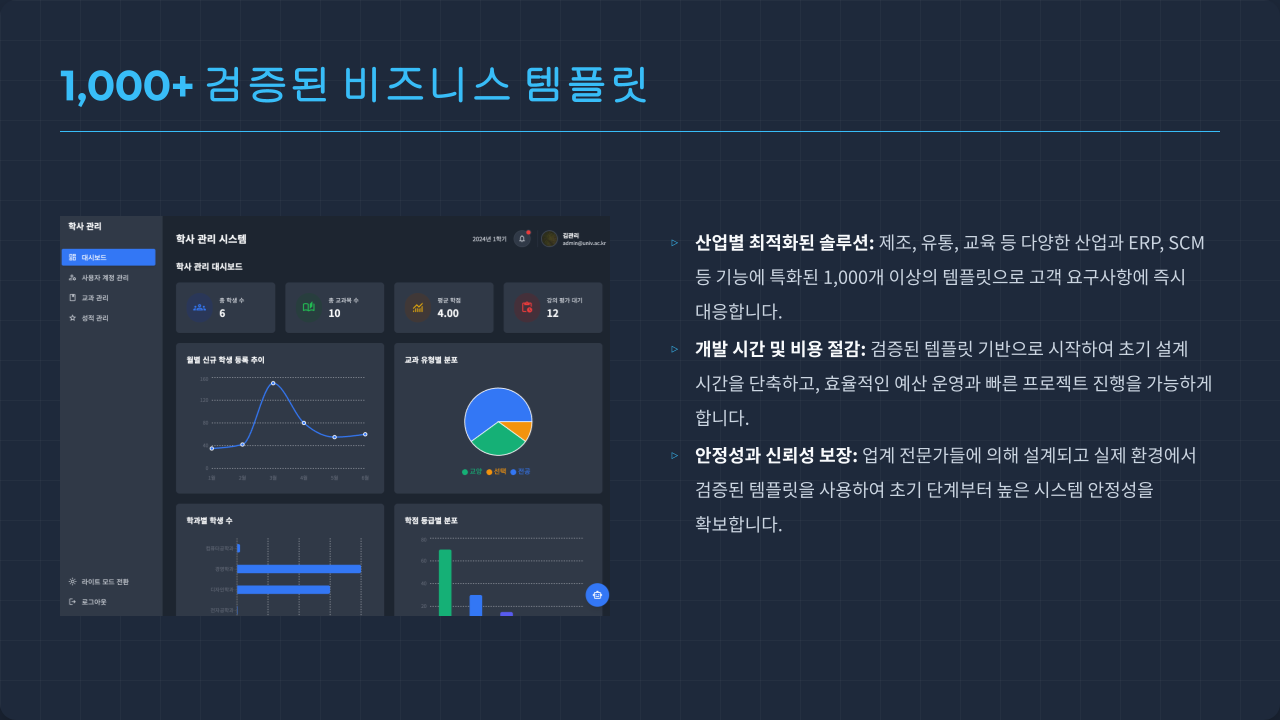 아이데브 덕분에 학사 관리 시스템을 3개월 만에 구축할 수 있었습니다. 개발 비용도 70% 절약했어요.